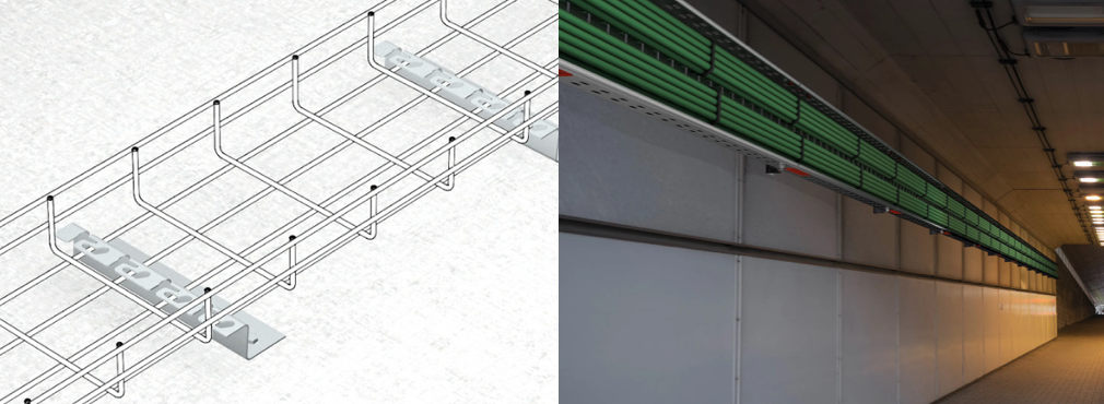 Le chemin de câble fil, d’une longueur de trois mètres, est préconisé pour les courants forts en raison de sa structure ouverte, qui permet une aération optimale des câbles et limite ainsi leur échauffement. De plus, il facilite l’identification des câbles par un contrôle visuel.