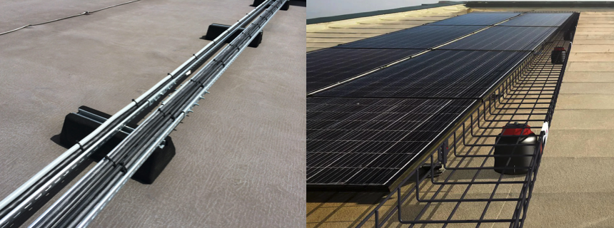 En toiture terrasse, nous proposons une solution : le support terrasse, plus connu sous le nom de Big Foot, fabriqué en caoutchouc recyclé. Léger mais suffisamment lourd pour rester en place, il est posé tous les 1,5 m à 2,0 m et sert de support au cheminement. Nous peroposons également la solution Totem de chez Pemsa , un petit plot en plastique qu'on peut remplir de sable ou d'eau afin de l'alourdir Ces produits sont particulièrement adaptés car leur conception garantit l’étanchéité de la toiture, évitant ainsi les fuites.