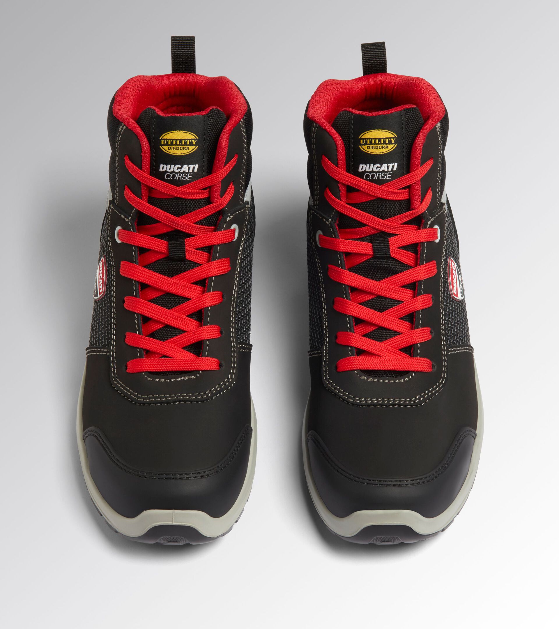 Chaussures de sécurité mi-hautes S3S hydrofuges en Action Nubuck, cuir bovin effet daim habillé d’un film de protection polyuréthane avec finition Nubuck et Atom, tissu polyester avec des fils de renfort en polyuréthane. Griffe DUCATI CORSE. Protection du bout en