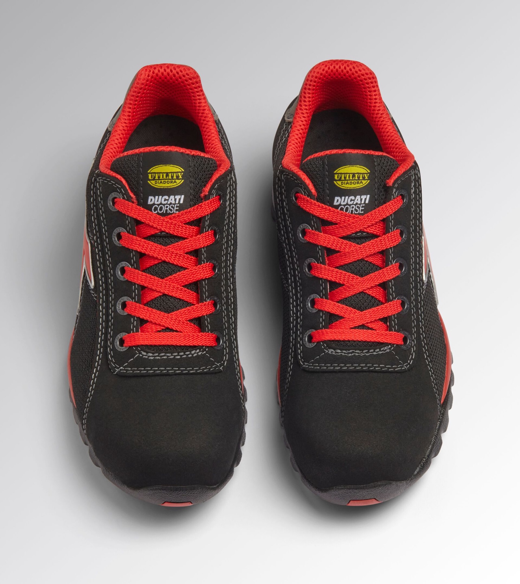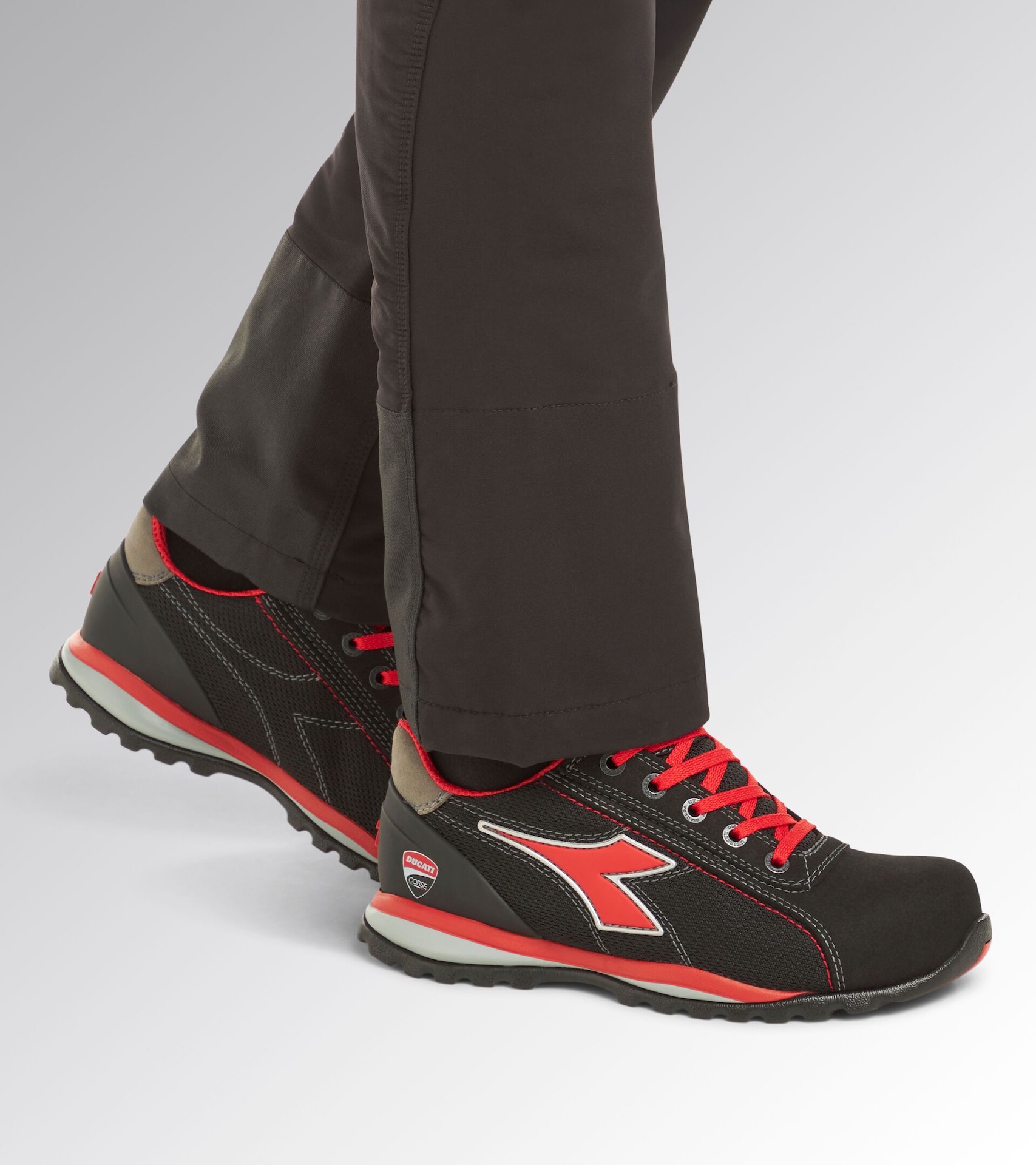 Chaussures de sécurité basses S1PS en microfibre effet daim et polyester. Griffe DUCATI CORSE. Support ergonomique du talon en TPU. Bout en aluminium 200J. Insert antiperforation K-SOLE. Chaussant 10. Doublure en mesh 3D alvéolaire. Semelle de propreté amovible et microperforée en mousse PU à cellules ouvertes, respirante et avec traitement aux charbons actifs.