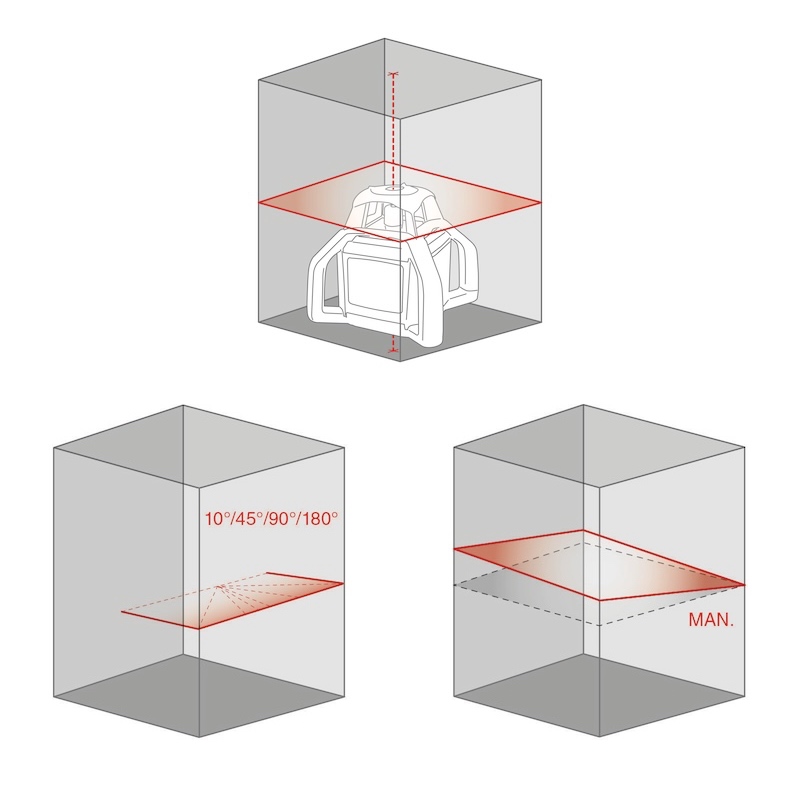 En faisant tourner le dispositif de 90°, il génère un plan laser vertical et un rayon horizontal auto-stabilisé